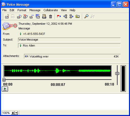 A voice message is received as a FirstClass message with a .wav file attachment. The first time you open the message, the attachment will play automatically.