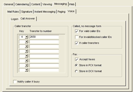 When someone calls your FirstClass Unified Communications number and you do not answer, they are transferred Voice Services. Your preferences and greetings are accessed and, based on these, the call in routed in the appropriate way. Some of these options include automatically transferring the caller to another number, playing a specific customized greeting for the caller, or playing a generic greeting for the caller and allowing the caller to leave a message.