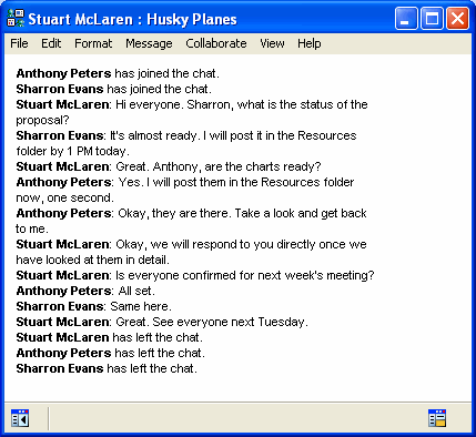 At the scheduled time of the meeting, Stuart invites each member of the Commuter Project team. The instant messaging sessions provide a forum similar to a boardroom or teleconferencing setting, where each member can contribute.