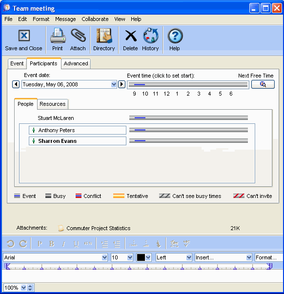 Stuart can schedule the meeting, invite team members, book the boardroom and any other required resources, all at the same time. This means he doesn't have to run around trying to coordinate everyone's schedules and make sure the boardroom and other resources will be available. He can do all of this from one location.