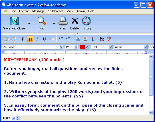 Madelyn now has all of the exams in one spot. She doesn't need to carry a stack of papers home to grade. Whether she is at home or at school, she can log in and review all of the exams. She grades each exam by creating a reply message addressed to the student and adding comments or grades to each question.