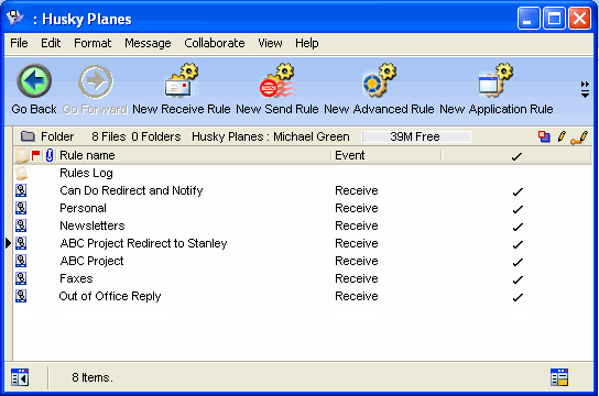 Once Michael has created all of the rules, he needs to put them in order to ensure that messages are handled properly. This is what the rules list looked like before Michael added the new rules.
