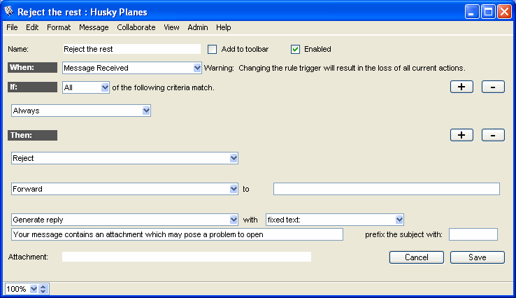 Husky Planes has a News conference where staff posts information for everyone's benefit. The administrator decides to make his job easier by automating management of this conference. He creates a set of four advanced mail rules to filter messages and reject those which lack a subject or contain an attachment that is platform-specific.