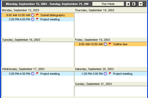 He can also differentiate events with color. For example, he may use one color to schedule meetings, and another to schedule milestones.