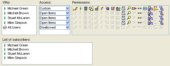 He also subscribes them to the database by entering their names in "List of subscribers". This puts an alias of the ABC project contact database on their Desktops. To access the database items, the team members simply drag the database into their Contacts folder.