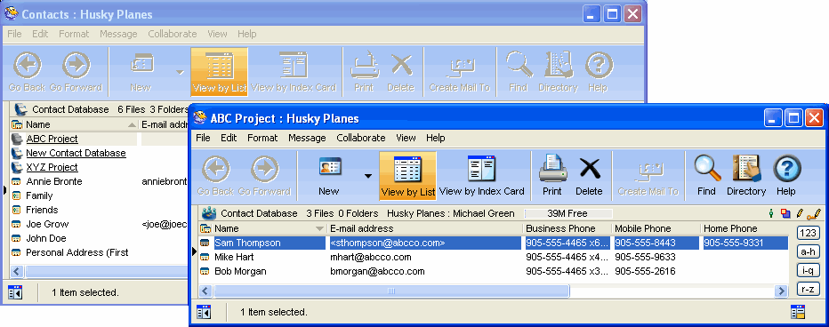 Michael creates contact databases within his Contacts folder for personal contacts and contacts involved on the various projects he is overseeing, including the ABC project and the XYZ project.