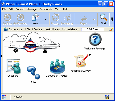Michael posts a feedback survey in the Planes! Planes! Planes! conference. In the last half hour of the seminar, participants are asked to complete the survey (which is a stationery document) and submit it to the Survey submissions conference (located on Michael Green's Desktop).