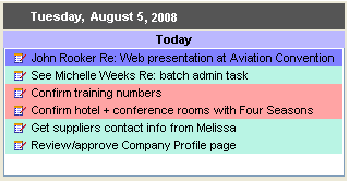 This example uses color to differentiate the types of tasks. Work for Michael to do is yellow, personal information is orange, and seminar stuff is pink. Overdue projects are blue.