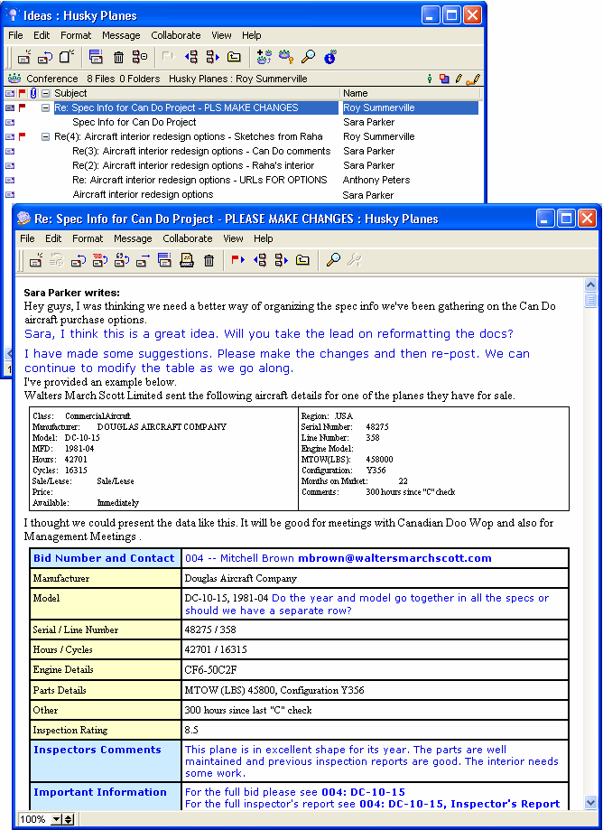 This is a sample conference used for brainstorming. Two conversations (or brainstorming sessions) are occurring, and they are organized by subject using the threading feature.