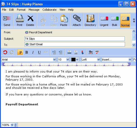 A new message appears in their Mailbox listing the Payroll Department as the sender.