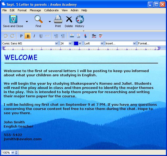 John decides that he also wants to add a background image to a welcome document he plans to make available to parents in the Parents conference.
