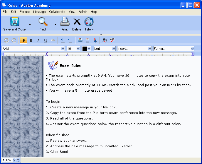 At 9 AM, Madelyn lets students open the exam. She gives students access to the exam by providing Reader access to the Mid-term Exam subconference. Students copy the exam content into a FirstClass message and complete the exam online.