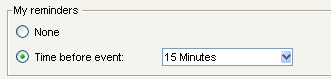 Madelyn also creates an end-of-exam warning to notify students when there are only 15 minutes left before the end of the exam. She does this by creating a calendar event called End of Exam, scheduled to start at the end of the exam time. She enters each student's name on the Scheduling tab and sets a Reminder for 15 minutes before the event.