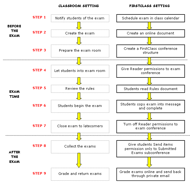 This flowchart compares how you traditionally give an exam to how you would do it in FirstClass.