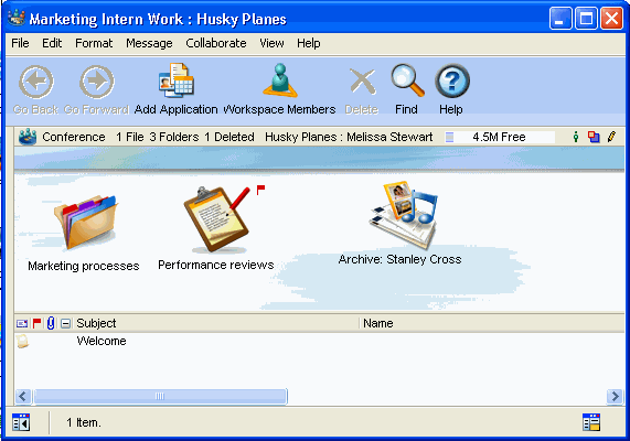 At the end of Stanley's internship, Melissa creates a folder for Stanley's work and archives his files and discussions in that folder. She reuses the Marketing Intern Work workspace, Marketing processes, and Performance reviews stationery document for future interns.