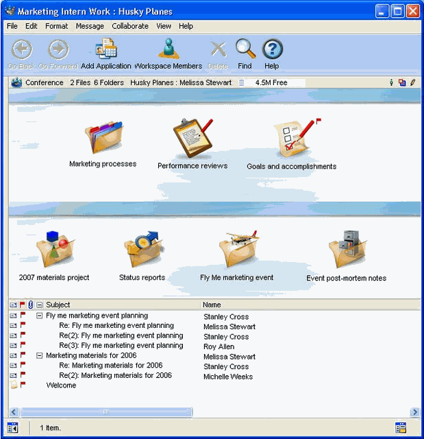 Once Stanley is subscribed to the conference, he creates project folders and documents for his work. Stanley, Melissa, and other Marketing employees post questions and comments about his projects to the conference.