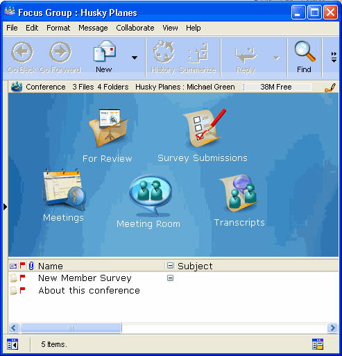 What if you can't get everybody in one room at the same time? Why not use a FirstClass conference to manage your focus group? You can post and collect surveys, post information for review, include movie files, sound files, or any other required information. You can use a calendar to manage focus group meetings, and folders to archive information.