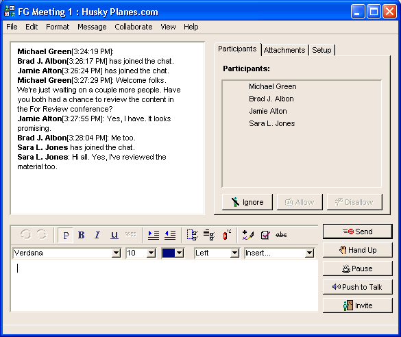 Michael holds the focus group meetings using a chat room. At the scheduled time, members simply open the chat room and start participating.