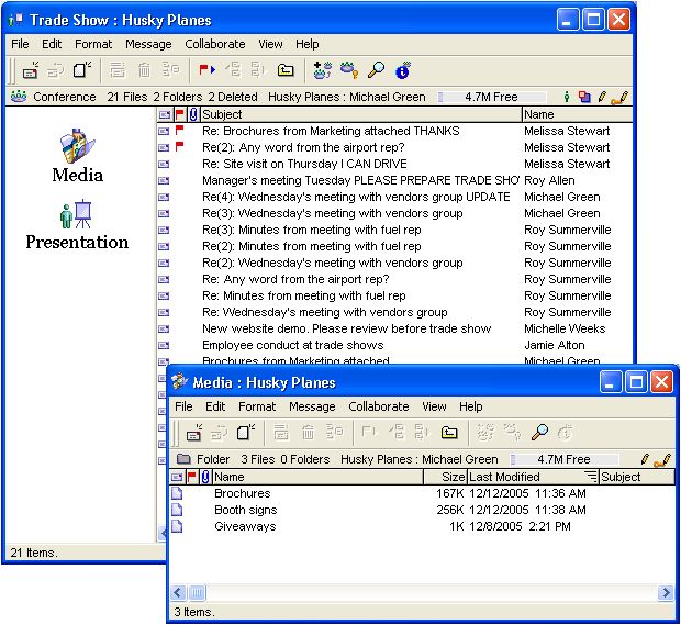 A Marketing Manager, Michael Green, is responsible for creating a new web site and planning a trade show. He creates a conference for each project. Information that is shared between projects, such as graphics, is put in a separate container, and he lists documents underneath the respective containers. He will share these conferences with his Marketing employees by aliasing the conferences to the Marketing Area.