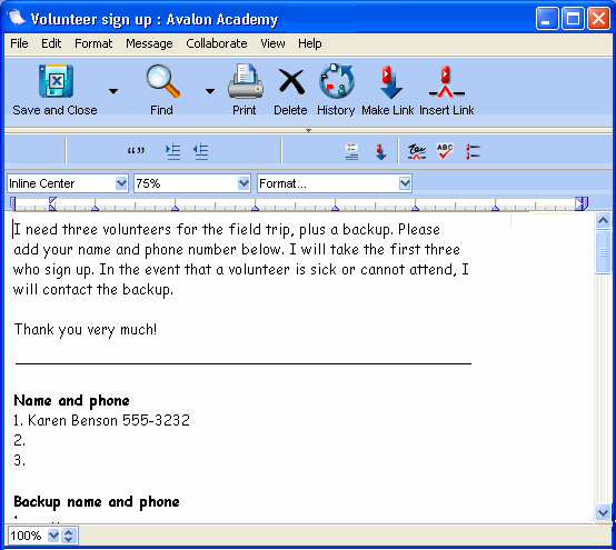 John requires three volunteers for the field trip. He creates a document inside the Field Trip conference where parents can sign their names. The first three parents to sign up get to go on the trip.