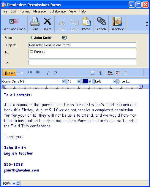 Although the information is posted for all to see, John wants to make sure parents haven't forgotten to check the conference. He has a mailing list called Parents where he has all of the parents' home and work email addresses. A couple days before permission forms are due, he sends out an email reminder to this mailing list.