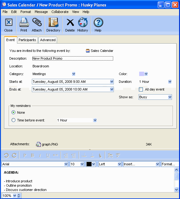 This is the event he created. He attached a file for review and included an agenda in the text area.