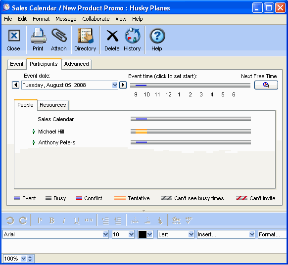 Michael invites the members of the sales department by entering their names on the Scheduling tab. From this screen, he sees who may have a time conflict. He adjusts the date and time as needed (the booked times for the resources and locations will also change automatically). The presentation will then appear in each of their personal calendars.