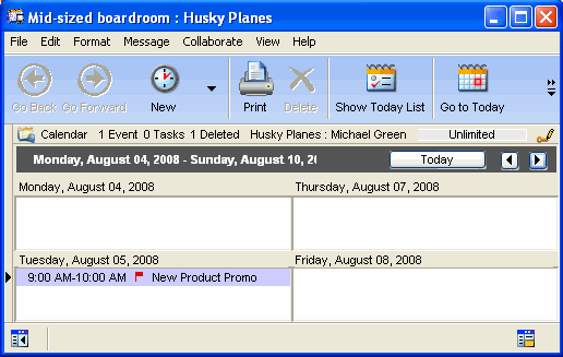 When he entered his requests on the Resources tab for the New Products Promo event, a new event appeared in each item's calendar. Husky Planes' IT department monitors the resource and location calendars and ensures that requested equipment is ready for use when scheduled.