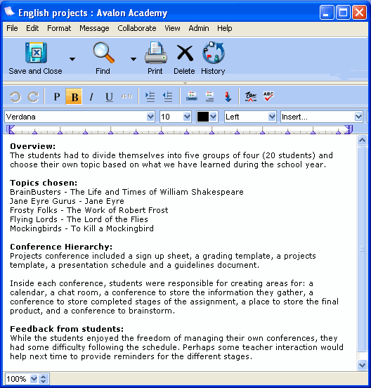 Do you maintain hard copy files from year to year to remind you of what projects you have done and how they turned out? Consider using FirstClass documents to maintain a journal from one year to the next. Record session notes, problems encountered, how you handled obstacles, new ideas, best practices, and so on.