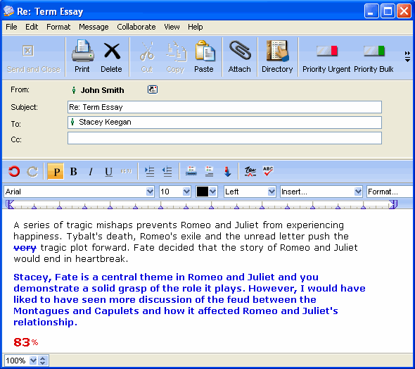 John doesn't need to carry a stack of essays home to grade. Whether he is at home or at school, he can log in and grade essays. He grades them by creating a reply message addressed to the student and adding comments in blue using Verdana Bold 10. He includes his assessment and grade at the end of the essay.