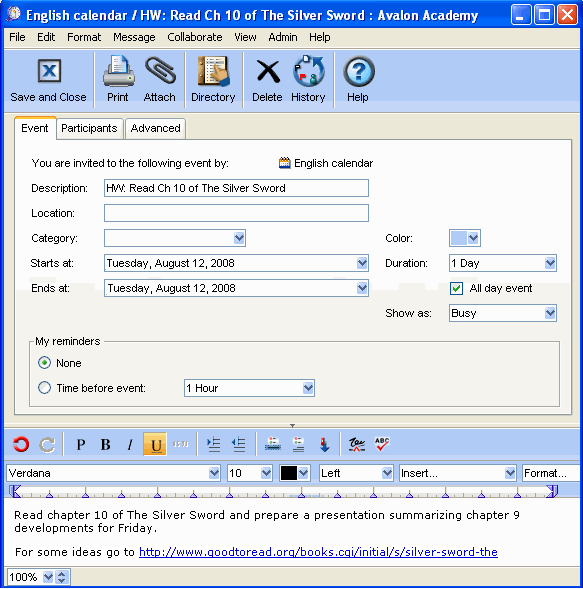 John puts the assignment information directly in the calendar entry. This is a calendar entry. Notice the homework assignment listed at the bottom. There is also a link to a web site that discusses the content further.