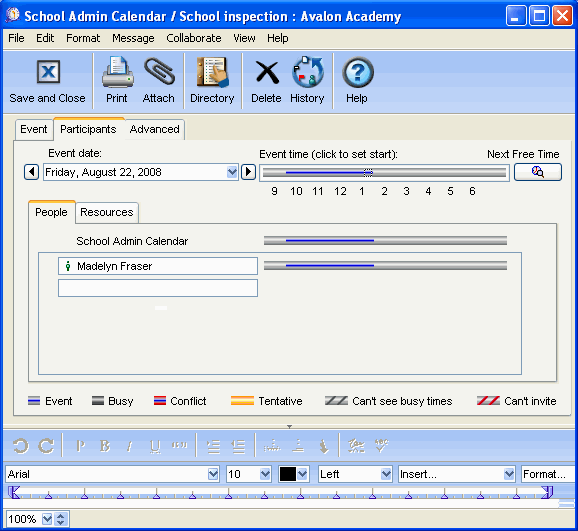 Want an easy way to notify everyone of upcoming school inspections, provide an electronic trail, and avoid the cost of paper copies? Use a FirstClass calendar to schedule the event. It can appear in the group calendar, as well as in any personal calendars you wish.