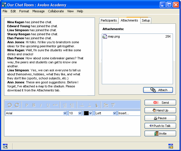 Ann sometimes holds online meetings in Our Chat Room. On the Attachments tab, she can provide files in the chat room for the mentors to download if necessary.