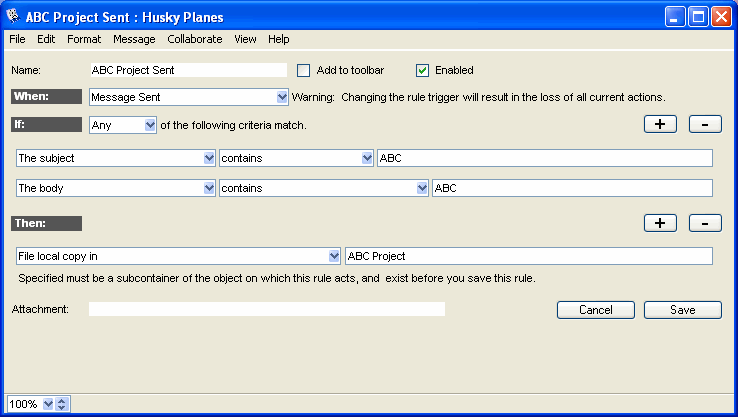 This Advanced rule checks if the mail contains the word "ABC" in its Subject field. If it does, the sent mail is filed automatically in the ABC Project folder.