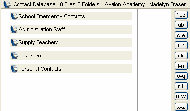 Madelyn creates contact databases within her Contacts folder for personal contacts, teachers, supply teachers, school administration, and emergency numbers.