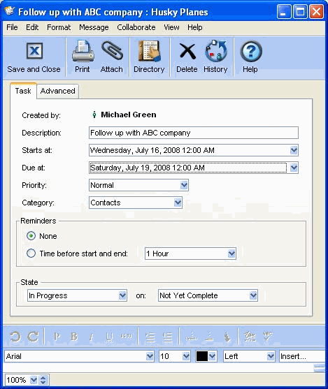 Michael Green has a lot of tasks on his plate. He is the manager of Sales and Marketing at Husky Planes, so not only does he have to manage his own projects, he also has to keep track of the status of his employees' projects. To accomplish this, he uses the task manager located in his FirstClass personal calendar.