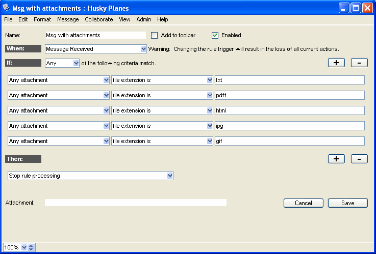 He creates the second rule, "Msg with attachments". This rule accepts certain cross-platform attachments, then stops mail rules: