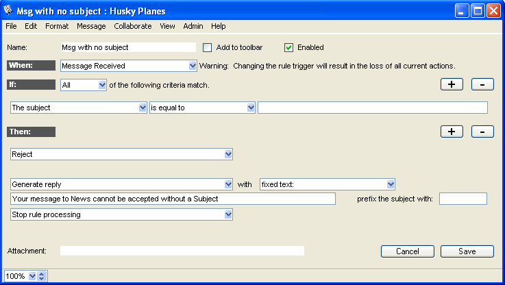 Husky Planes has a News conference where staff posts information for everyone's benefit. The administrator decides to make his job easier by automating management of this conference. He creates a set of four advanced mail rules to filter messages and reject those which lack a subject or contain an attachment that is platform-specific.