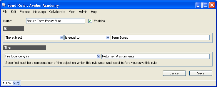 John Smith teaches Grade 12 English at Avalon Academy. He requires each student to write one essay per term. Students send their essays to an Assignments conference. Late assignments are subject to a penalty, so John created a mail rule to file any essays arriving after the due date in a Late Submissions subconference.
