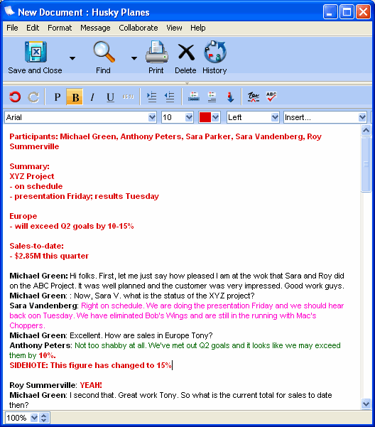When the meeting concludes, Michael moves the chat room into a folder called Meeting Minutes for everyone to view. Whenever somebody opens the chat room session in the future, they will see a transcript of the meeting in the chat window.