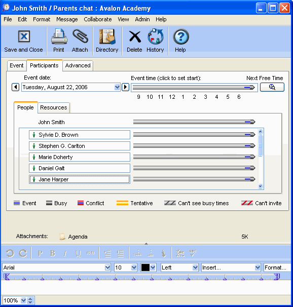 Instead of sending a reminder email to each parent, John can enter parents names on the Scheduling tab so that the meeting appears in their personal calendars. He can also schedule an automatic Reminder using the Event tab.