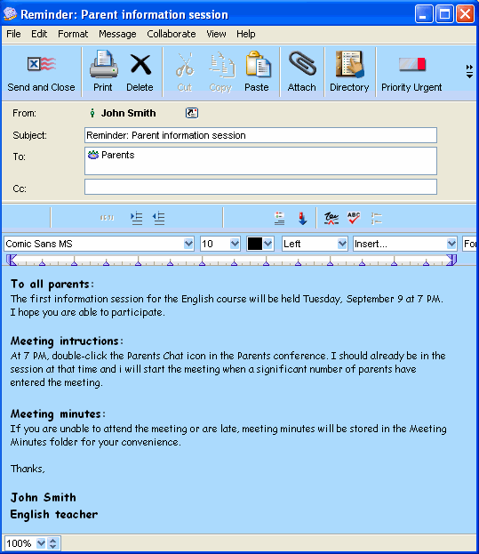 Looking for a simple way to talk to parents on a regular basis? Use the chat room feature of FirstClass to chat live with parents regularly during the term. After each meeting, save the session transcript and post it for the benefit of parents who can't participate, so you don't have to worry about recording minutes.