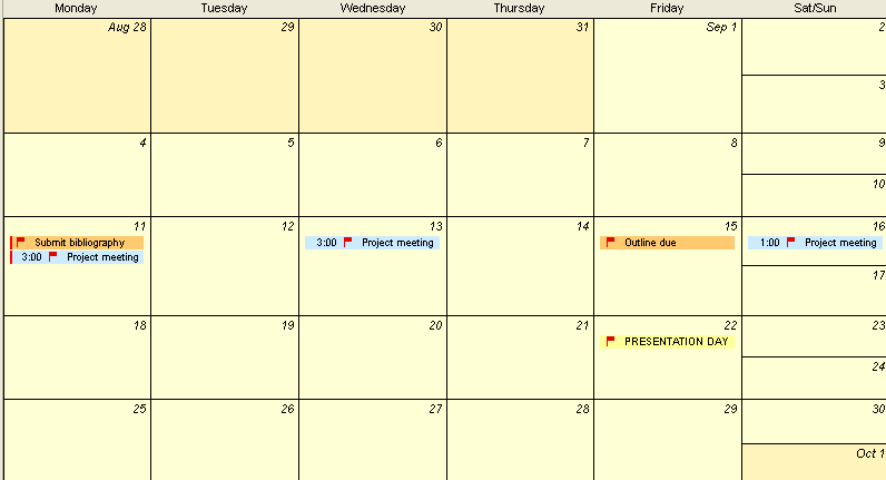 He can also differentiate events with color. For example, he may use one color to schedule meetings, and another to schedule milestones.