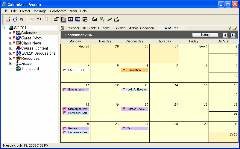 Michael uses his class calendar to schedule homework, tests, and special events. He lets them know which lessons will be covered and when, what is for homework, and details of special events. In his class calendar he records lessons in purple, homework in blue, events in orange, tests in pink, and so on. Parents log into their children's accounts regularly to see what is happening in Mr. Goodman's Science class.