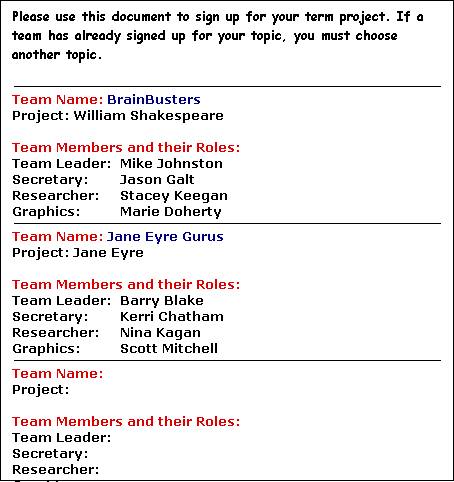 • have students enter their pertinent information, such as topic chosen, team members, and member roles, in a preaddressed form.