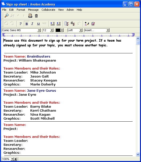 A team of four got together and decided to call themselves the "Jane Eyre Gurus". Their teacher required a document from them outlining the team and the project name. They completed the following document.