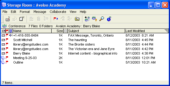 The Gurus collect the majority of their information from the Internet, books, and an English studies newsgroup. They also fax photocopies of graphics into FirstClass and drag them into their Storage Room conference. Here is their Storage Room conference with some of the ideas they have gathered.