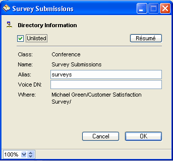 This is where customers send their completed surveys. He assigns an email address to the conference by clicking Directory on the Permissions form and entering the desired email address in the Alias field.