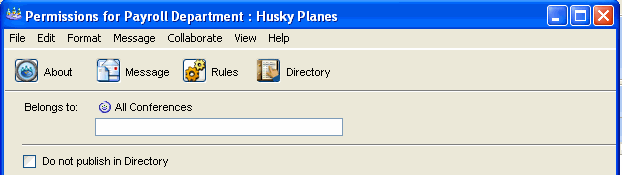 The conference must be published in the Directory to create messages appearing to originate from it. If you have permission to change conference permissions, uncheck Do not publish in Directory. Otherwise, contact the conference controller to do so.