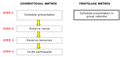 Here is a comparison of the conventional way you may book resources and how you would do it in FirstClass.